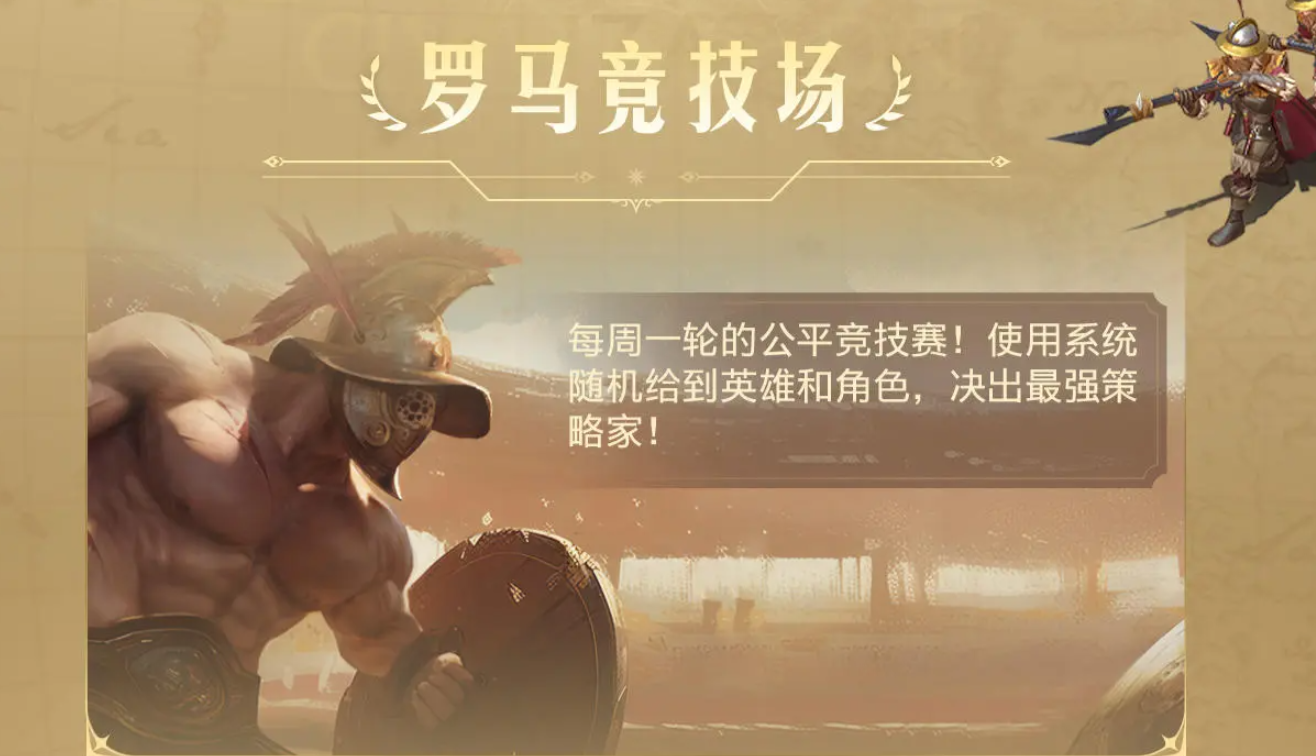 最后要介绍的是新玩法罗马竞技场,罗马竞技场是每周进行一轮的公平竞技玩法,系统会随机给与玩家英雄和技能,玩家可以在其中进行抽取并自由搭配组建队伍,与其他玩家的队伍进行1V1对战和排名,最终会根据胜负与排名发放奖励。