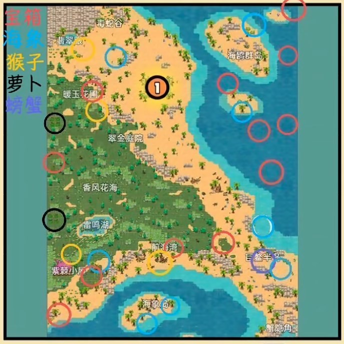 如图所示,地图上红圈标记的地方就是宝箱所在,森林里有2处,沿着南边的海岸与四个,地图东边海域还有6个,大家可以对照着去完成这些宝箱的收集。