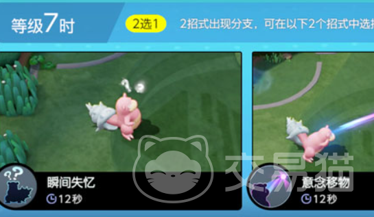 二技能是偷懒,使用技能后可以使hp不断的恢复,升级之后分为瞬间失忆和意念移物两个技能,瞬间失忆可以降低一部分自身受到的伤害,使用技能后可以短暂的免控,增加自身的物理防御,对下一次的攻击伤害有提升效果,意念移物可以对敌方宝可梦造成击飞效果,击飞后二次使用技能可以将敌方宝可梦拉向自己身前,技能升级后会增加攻击距离。