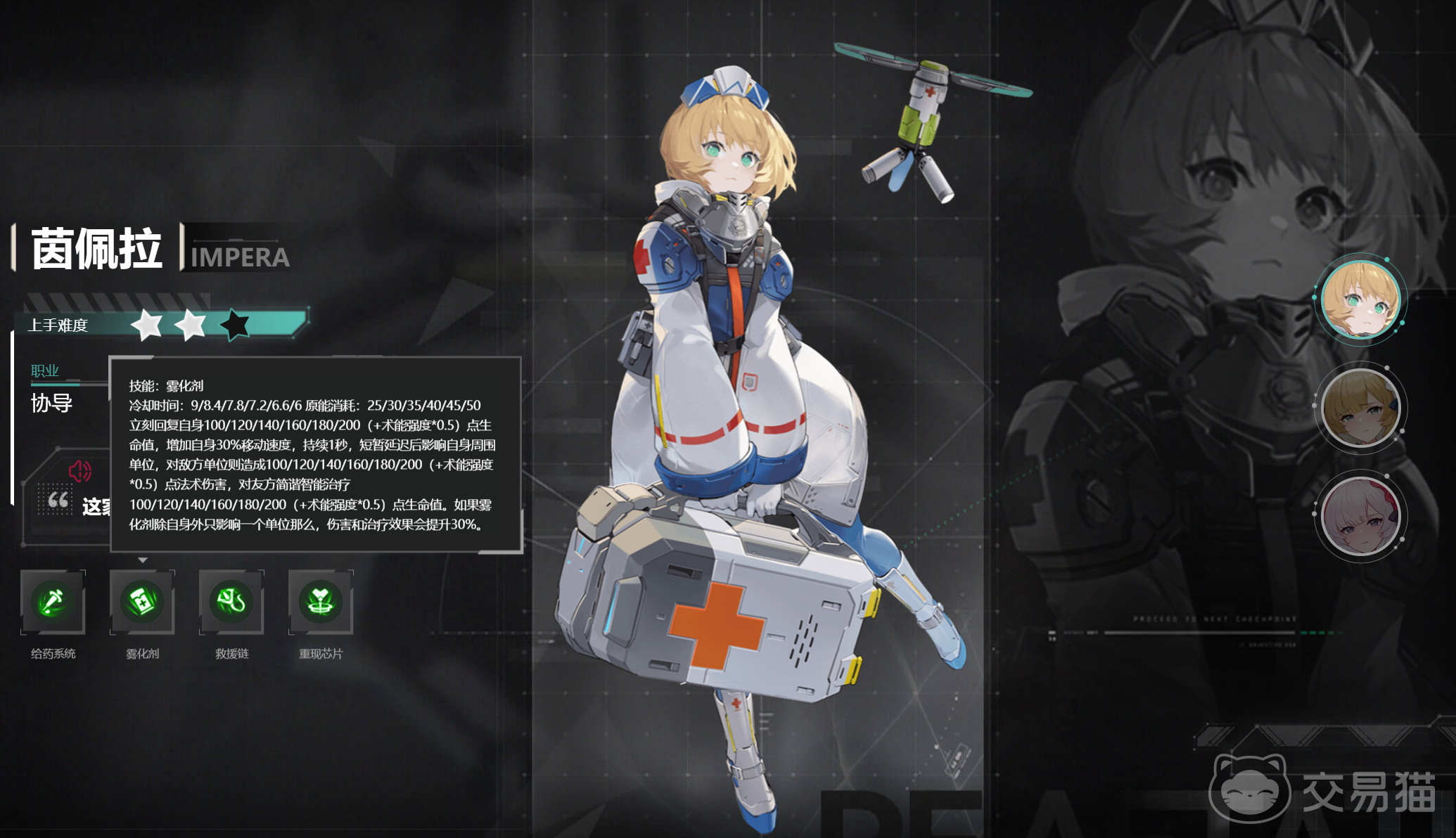 茵佩拉的技能机制非常独特,她的1技能雾化剂不仅能治疗自己和队友,还能对敌人造成伤害。在使用时,需要注意站位,尽量让治疗量更多地作用于残血的队友收益是最高的,而非状态良好的队友,而后期的话专注c位即可。2技能锁链则是一个集控制和保护于一体的技能,命中敌人可以拉近距离并眩晕,命中队友则可以让其快速回到身边并获得加速效果。大招更是茵佩拉的大反手技能能够复活区域内率先阵亡的两名队友,极大地提升了团队的容错率。