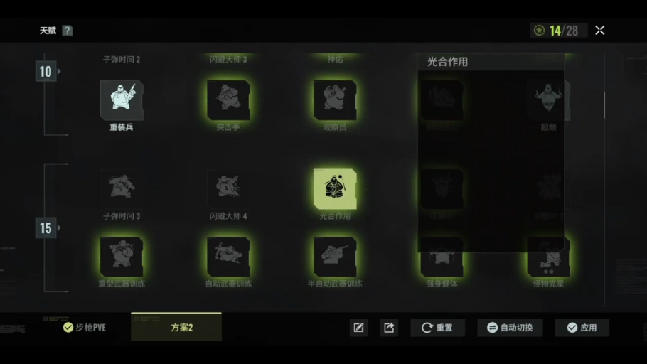 第六个是宅男,在玩家血量高于50%时,伤害输出增加6%,血量少于50%时,受伤害值减少2%。第七个是变化体质,根据辐射值变换。第八个是人造身体,提升所需芯片等级之后,增强所有属性。第九个是朝阳群众,野外探索视野拓展30米。第十个是炸弹人,扔手雷时伤害提升15%。十一个是天命之子,全属性提升2%。十二个是医疗专家,血量增加4%,被治疗时效果增加20%。