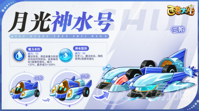 关于西普大陆手游月光神水号分享就到这里了,这是游戏里外观比较独特的一个精灵角色,其他基本上都是动物或者是植物,像这种赛车设定的精灵还是比较少见的,如果想选择水属性的精灵,那么月光神水号绝对是最好的选择,玩家可以尝试用这个精灵的水属性去压制其他的对手。