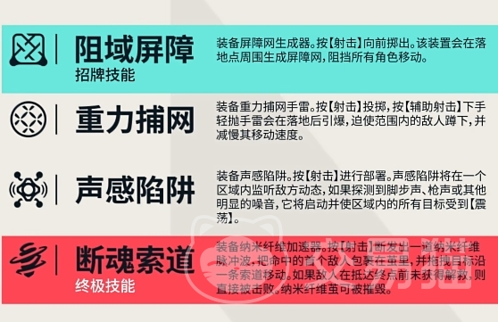断魂索道是钢锁的一项终极技能,使用后会装备纳米纤维加速器,当按下射击键时,一道强大的纳米纤维脉冲波将被发射出去,将命中的首个敌人紧紧包裹在茧里,并沿着一条预设的索道拖拽目标移动,如果敌人在抵达终点前未能获得解救,那么他们将直接被击败,需要注意的是,这个纳米纤维茧是可以被摧毁的,因此在使用这一技能时,钢锁需要密切注意战场动态,确保敌人无法逃脱。