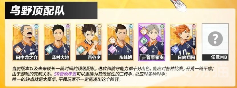 乌野顶配队无疑是当前版本乃至未来较长一段时间内的顶级选择之一,这支队伍由田中龙之介、泽村大地、西谷夕、东峰旭、管原孝支、日向翔阳以及任意MB球员组成,无论是进攻还是防守能力都极为出色,能够应对各种比赛挑战,帮助玩家顺利开荒,由于游戏中存在属性克制关系,SR营原孝支可以根据对手的特点替换为其他属性的二传手,以增强队伍的适应性。