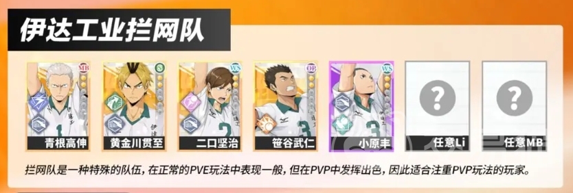 最后的伊达工业拦网队由青根高伸、二口坚治、链谷武仁、小原丰以及任意Li和MB球员组成,这支队伍在PVP中比较适合,其中青根高伸作为队伍的核心,拥有出色的拦网能力,他的存在能够提升整个队伍的士气,而且他的拦网属性极高,能够轻松阻挡对手的进攻,为队友创造反击的机会,二口坚治则是队伍中的另一位重要拦网手,他与青根高伸搭档,能够形成一道坚不可摧的防线。
