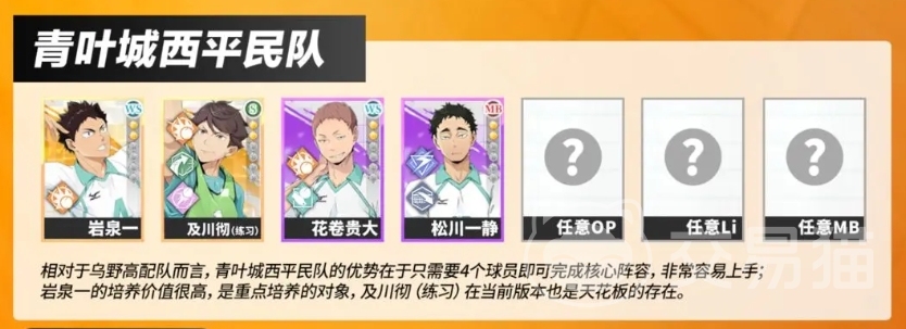 此外乌野高中羁绊能让上阵4名及以上乌野高中球员时,所有球员的强攻与快攻属性增加10%,除了乌野顶配队外,还有一套适合平民玩家的阵容是青叶城西平民队。这个队伍由岩泉一、及川彻、花卷贵大、松川一静以及任意OP、Li和MB球员组成,与乌野高配队相比,青叶城西平民队的优势在于只需要4个核心球员即可构成完整阵容,非常容易上手。
