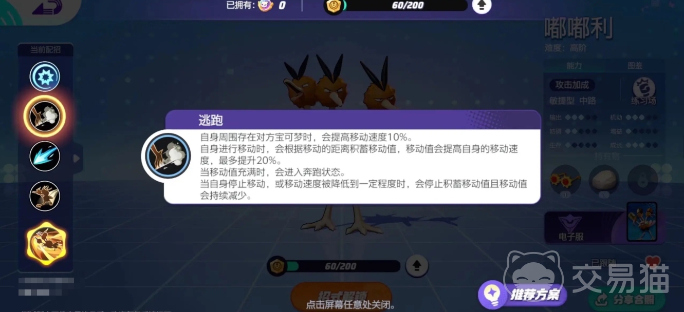 嘟嘟利也是属于敏捷系的宝可梦,一般都是走的中路,其第三次普攻是强化攻击,在奔跑状态时,下一次普攻会消耗所有移动值并向前突刺,对路途的敌人造成伤害,三重攻击效果是向目标方向的扇形区域进行横扫,随机对目标赋予“灼烧”、“麻痹”、“移动速度减少”等效果。