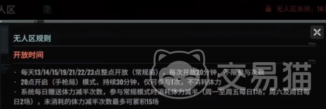 无人区模式会在下午1点钟整点开始,每间隔几个小时开放一次,具体的时间安排见图片。不过下午开放的模式是普通模式,而且每次开放只有20分钟的时间,超过时间玩家就无法进入无人区了。在20:00的时候会拥有一定射击技术的玩家开放【手枪局】模式,这个模式会持续30分钟的时间,而且只有1次机会。