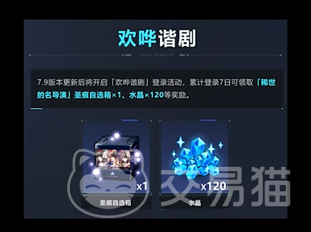 此次7.9版本中的欢哗谐剧活动,是一个为期七天的签到活动。只要每天登陆上游戏,再完成签到,大家就额可以免费获得一个圣痕自选箱以及120水晶。要知道圣痕自选箱可以让你在提升战力的路上事半功倍,再加上水晶奖励,实在是让人无法拒绝。