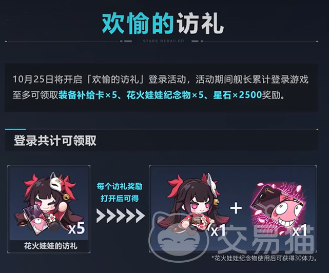 在活动开启的第一天,玩家上线后就会发现一项简单的每日登陆活动。只需要在活动期间每天登陆游戏,就可以领取到「花火娃娃的访礼」,兑换体力轻松无压力,每天30体力,积少成多,为后续的游戏内容做好充分准备。