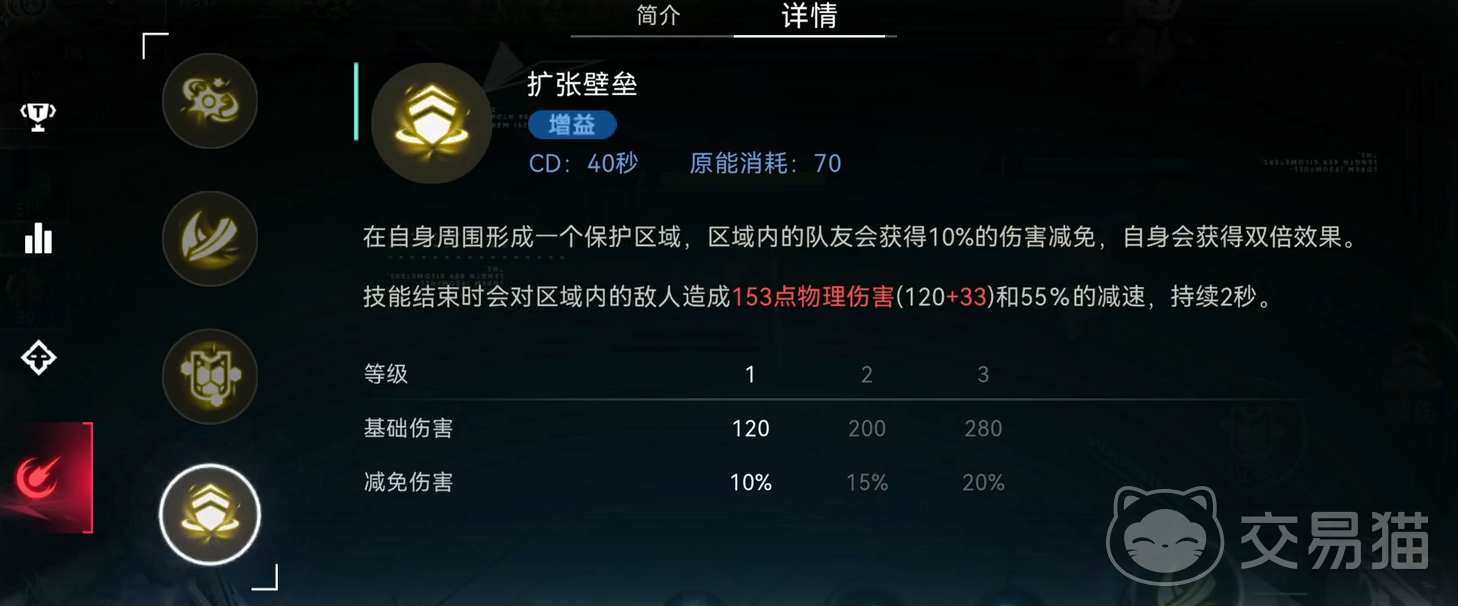 大招叫做扩张壁垒,可以让范围内的队友获得10%的伤害减免,自身则可获得双倍效果。另外大招结束时还会对敌人造成伤害,并附加减速效果。
