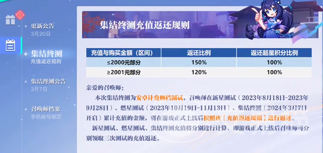 在内测时如果充值小于2000,在正式服上线之后就可以返回100%的超新积分,还有150%的点券。如果充值超过于2000,那么这一部分就会返还100%的超新积分,还有120%的点券。这一个规则就会适合于当前的测试环节中,包括星星测试,燃星测试以及终极测试。