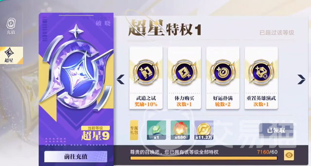 其中会包括充值关卡次数,每天购买体力的上限,还有通关奖励加成。超星特权一旦超过10级就能有机会免费获取曙光守护者,在特惠商店超星会员中还有一部分的礼包必须要达成超星特权级别才可以去领取购买。虽然英雄不能够继承,但这些点券全部都可以返还,不过在正式服中想要得到五星英雄或者六星英雄难度还是比较高的。