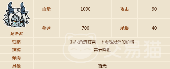 龙语者是现在非常强势的角色之一,他在一星状态下就拥有1000点血量,90攻击,700移动速度和40采集。达到二星时血量增加到1150,攻击力提升到100,三星时血量增加到1400,攻击力为120,其他属性则不变。附带的技能是雷云降世,同样有三种不同的星级效果。