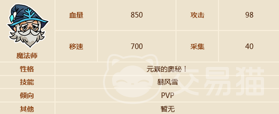 魔法师在实战中各项属性均衡,操作比较简单。在一星时血量为850,攻击力98,移动速度700,采集40。二星时血量增加到950,攻击力增加到110,3星时血量为1100,攻击力132。他的性格为元素的奥秘,使用的技能是暴风雪,比较擅长在pvp活动中发挥优势。相对于其他角色,魔法师的皮肤比较少,只有神王宙斯,星冕贤者和光辉魔导这三个皮肤。