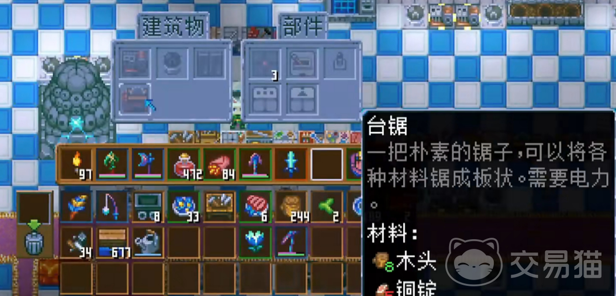 接下来,在电器桌上你可以制作一个台锯。台锯是将木材加工成木板的核心工具。当台锯制作完成后,只需将获取的木材放入台锯中,并保证其通电,台锯便会自动将木材切割成木板。