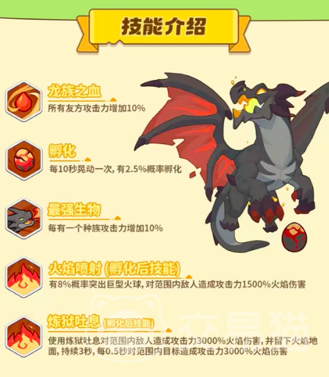 不过这个角色的技能还远不于此,在游戏中虽然没有明确的说明,但通过一些组合式的对决模式不难发现它还有其他两种技能,分别是最强生物,火焰喷射,炼狱吐息,不过后两者是孵化后才可以解锁的技能,这两种技能的对抗效率还是非常高的,最强生物是使没有一个种族的攻击力会增加10%,而火焰喷射则是有8%的概率喷射出巨型火球,对范围内的敌人攻击力造成1500%的火焰伤害。