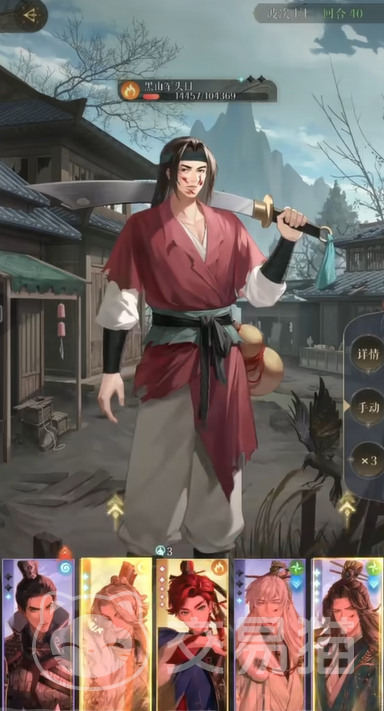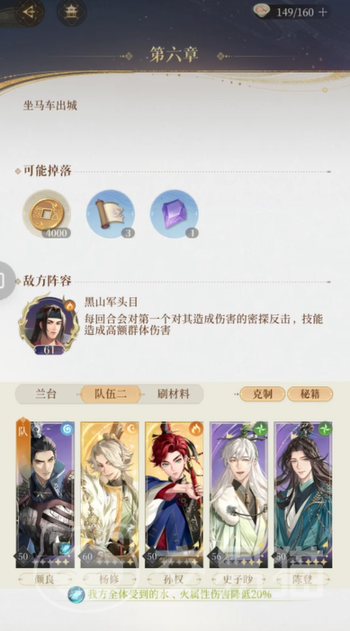 第6章第20关的BOSS是黑山军头目,他可是个61级的火属性大块头,总血量达到104369,相当之厚实。而且他每回合都会对第一个攻击他的密探进行反击,其三回合蓄满能量的大招还能造成高额群体伤害。这一关只有黑山军头目一个敌人,并且他免疫任何形式的劝退。成功通关后,你将获得4000五铢钱、三个兵书残卷以及一个紫石头。