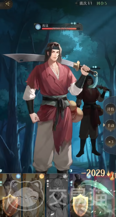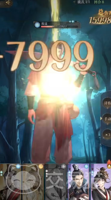 到了第三回合就是关键的一波了。鲁肃尝试劝退流寇头目,如果劝退失败,就果断重开局,因为劝退成功可以大大减轻接下来的战斗压力。同时,王粲和杨修开启他们的大招,以最大化输出。王粲的大招可以造成高额单体伤害,而杨修则适合群体攻击。其他成员继续使用普攻,确保稳定的伤害输出。