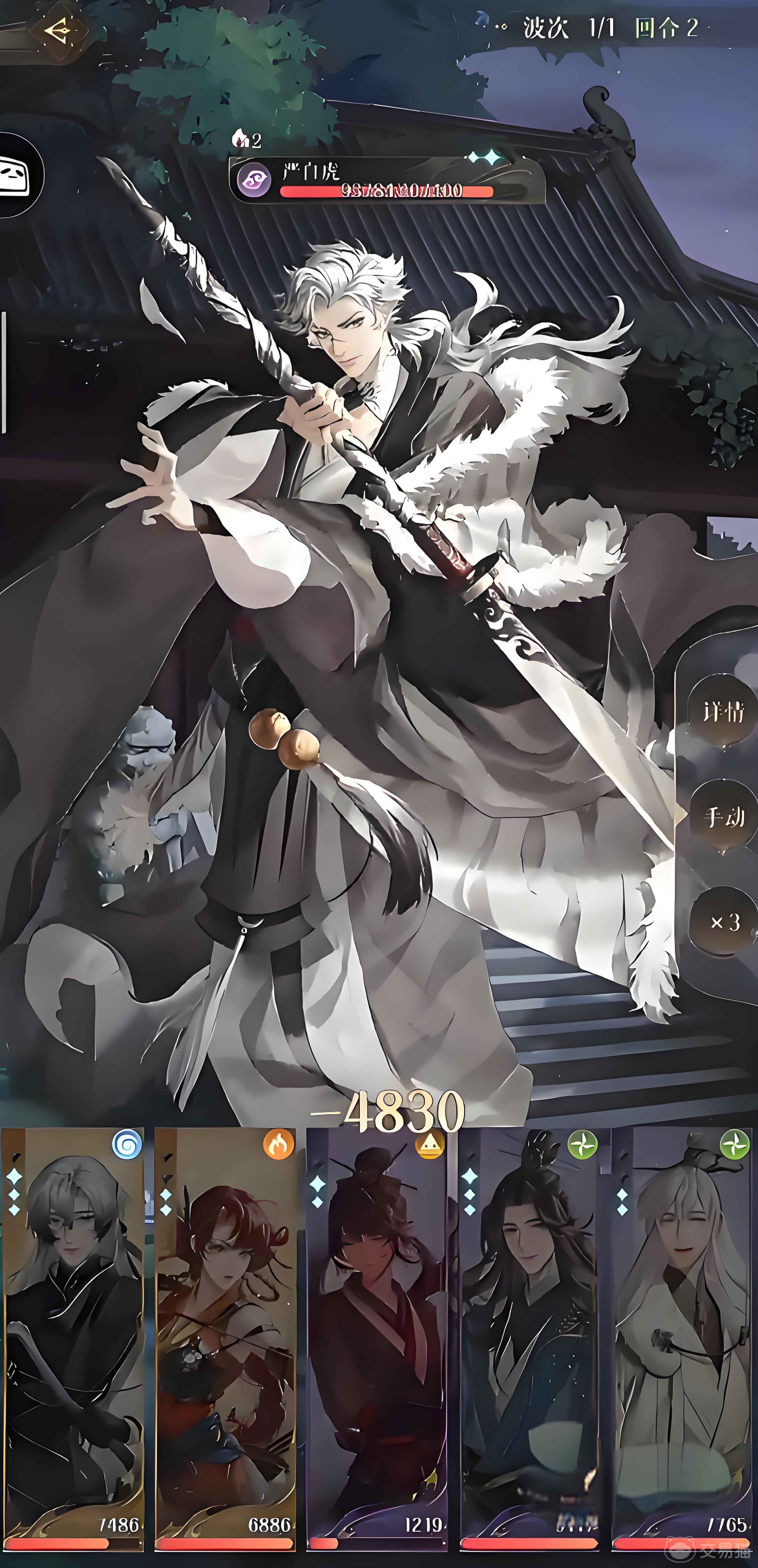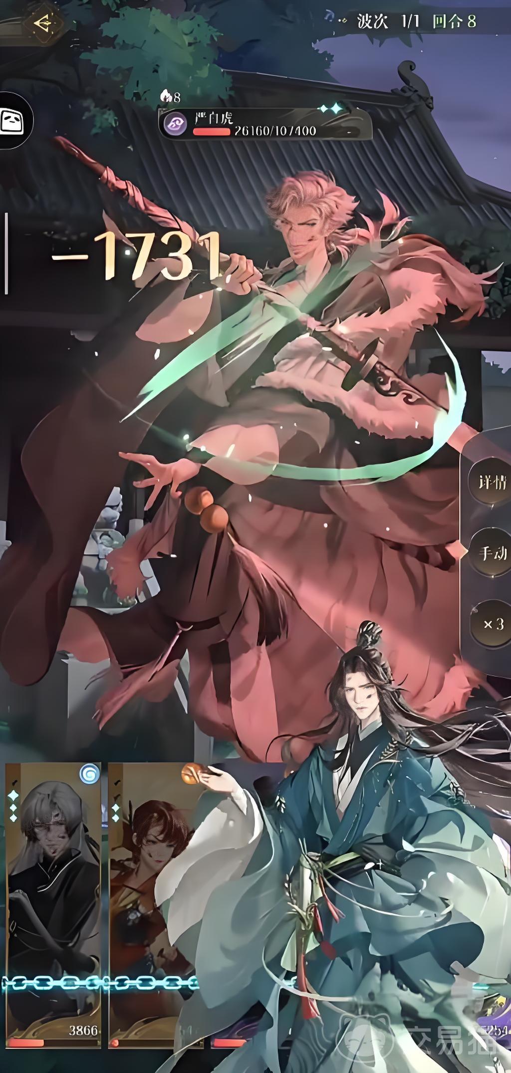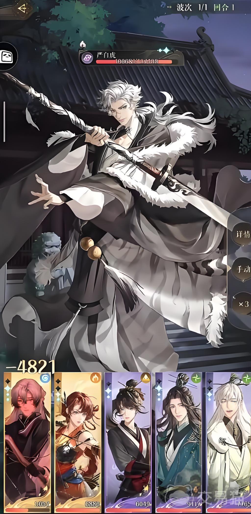 小编推荐的阵容搭配是王粲+孙尚香+阿蝉+陈登+史子眇。派出的密探修为尽量高一些,更好得三星通关。王粲的命盘大招能量-1,陈登能量+1.首先第一回合史子眇下拉防御保血量,其他人普攻。第二回合正常输出。第三回合严白虎放第一轮群体大招,王粲先开大招迎接,阿蝉、陈登、孙尚香,史子眇按顺序出招。如果能打出孙尚香暴击,就有可能获胜。第五回合阿蝉先放大招,其他人辅助攻击。第六回合严白虎放大招的时候,重复以上步骤,史子眇及时给队伍回血,在第九回合打出孙尚香暴击九获胜了。