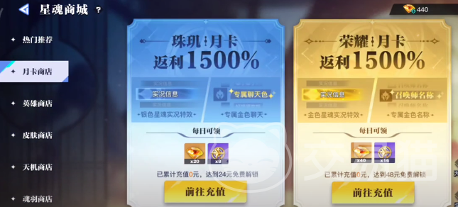 荣耀月卡还会有最高的返利,例如可以返利1500%,另外还可以享受一系列的效益,此时就能获得星魂战场皮肤。除了可以获得星魂战场皮肤之外,还可以享受专属的聊天色以及专属金色名称等一系列的效益。