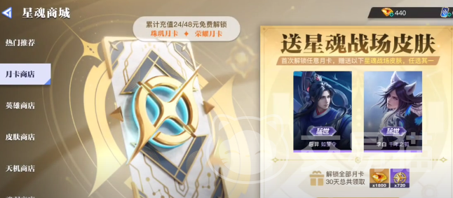 按照这样的方法就可以以性价比较高的方式获得皮肤,也有一些玩家想要获得更出色的皮肤,此时就可以选择解锁荣耀月卡,累计充值达到48元,就可以解锁最高档位的荣耀月卡。一旦在解锁之后对玩家而言就可以获得更多的皮肤。