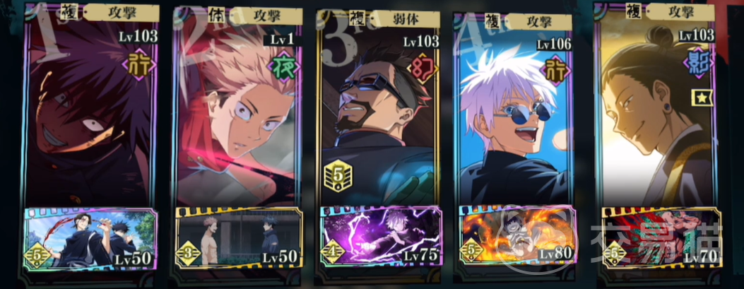 最后就是夏油,夏油这个角色可以提供额外的追加能力,能让队伍中的回合数增加,同时将虎杖悠仁的单体爆发能力进行提升,这样在面对多数场合都可以让所有人进行连携攻击,从而弥补五条悟不在的输出,这套阵容几乎不缺输出,自保能力也强,属于五条悟的强势阵容了。