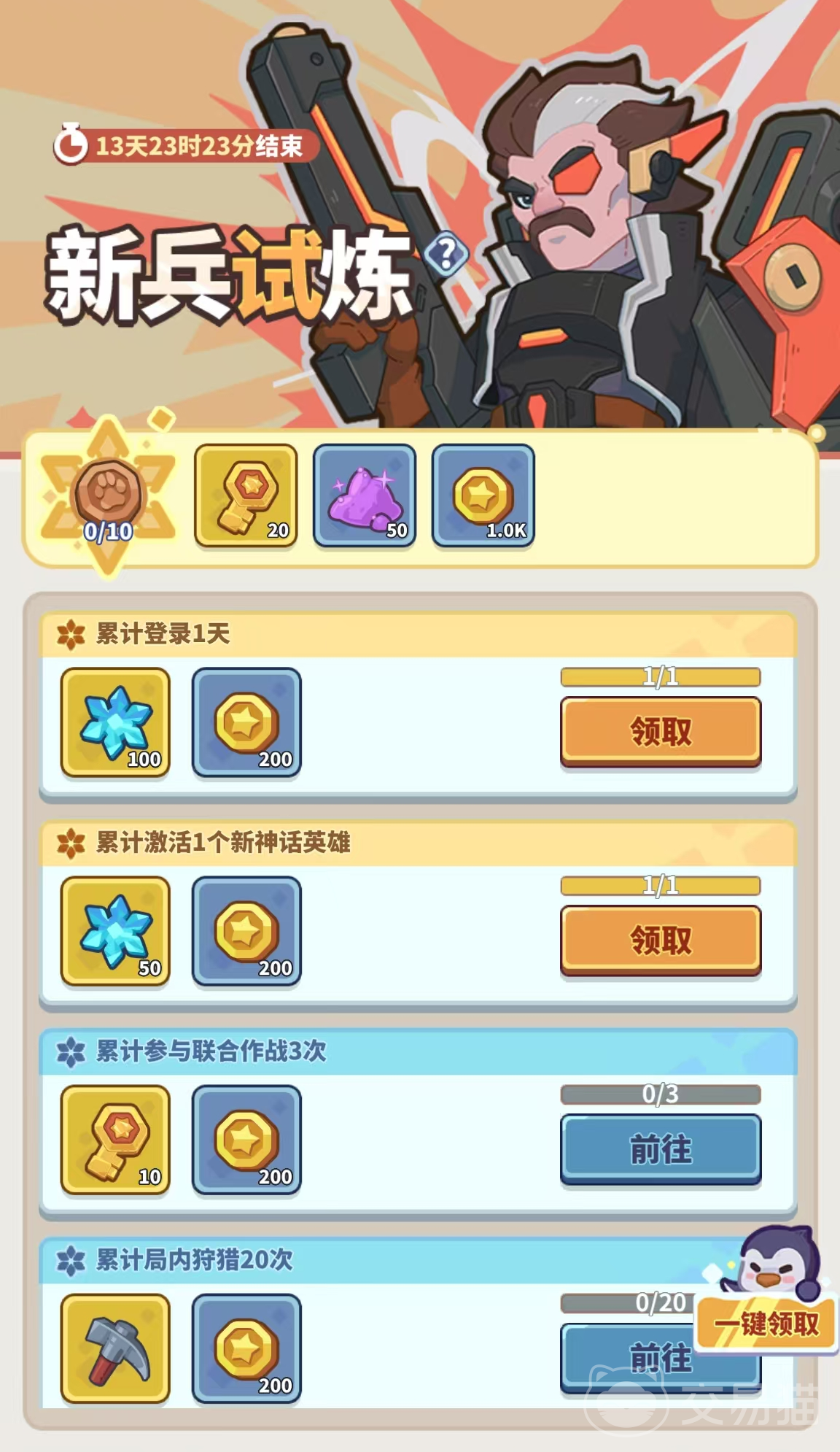 4、新兵试炼:这个相当于是建号时的新手活动,活动持续时间为14天。每日0点解锁下1天试炼,完成对应试炼天数的所有任务后即可领取对应试炼天数的进度大奖。不仅有大量的金币作为奖励,还有传奇角色可以领取哦。