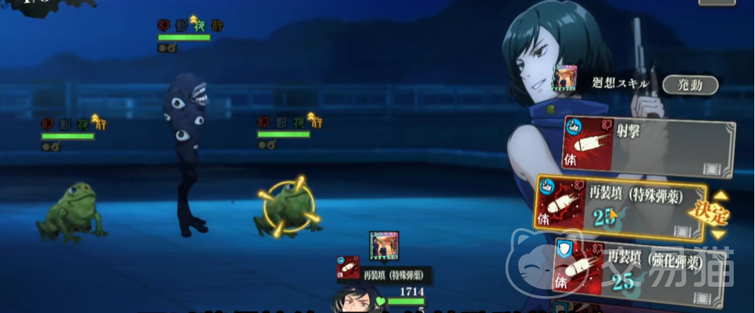 一技能射击消耗0点咒力,对敌方单体造成远程的体术伤害,自身处于特殊弹药状态时,对选择的敌人造成100%一回合的禁足负面状态,自身处于强化状态时,技能发生变化,可以对敌方全体造成远程的体术伤害,并赋予敌方受到的伤害提升20%,持续两回合的负面buff。