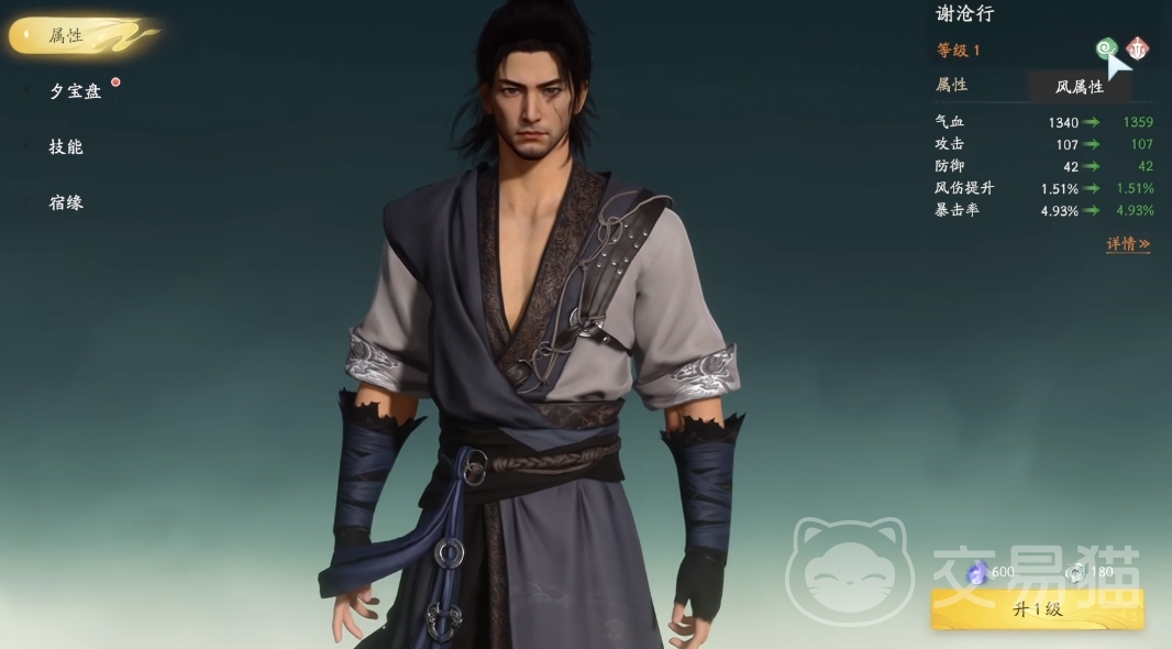 在基础属性上,谢沧行属于风系属性的角色,气血、攻击、防御、暴击率也中规中矩,如果想要让他上阵的话不建议让他站主C的位置,他更适合副C的位置。