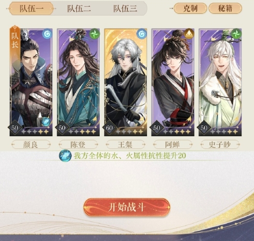 其实大家想要成功挑战的话,可以考虑去选择颜良、陈登、王粲、阿蝉、史子眇这样的组合搭配,其中颜良作为队长,可使己方全体的水、火属性抗性都能够提升20,这个还是非常不错的。