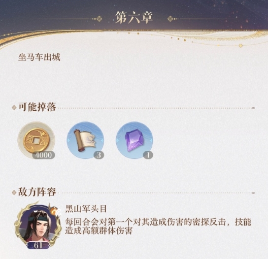 在玩家成功进入第六章的第20回时,就会遇到黑山军头目,他等级是在61级,并且效果为每回合会针对第一个对其造成伤害的密探进行反击,技能还会造成高额的群体输出伤害。