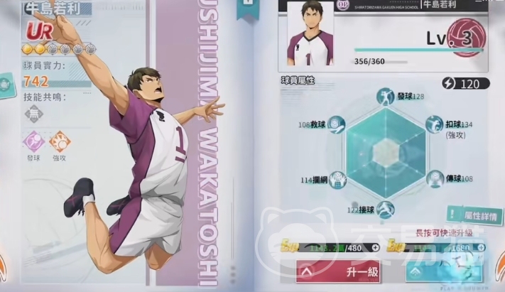 技能3则体现了牛岛若利作为团队核心的作用,每当我方队友暴击时,他的基础属性将得到提升,初始为+1.5%,随着等级提升可增至+2%和+2.5%,最多可叠加至8/8/10层,更为关键的是,当他自身得分时,能够清除身上所有的负面效果,也就是敌人之前施加的debuff,最后,牛岛若利的绝技威力基于强攻属性,初始为250%,随着等级提升可增至265%、280%、295%乃至310%。