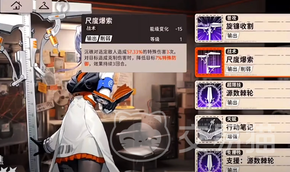 尺度爆索 战术:针对选定的敌人还可以造成85.98%的特殊性伤害,能级变化减15,如果对目标造成克制伤害,就可以降低目标10%的特殊防御,在持续性的三个回合中都有效果。