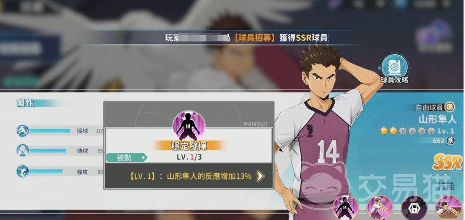 除非大家特别想体验纯粹的白鸟泽阵容,否则不建议优先抽取山形,其实山形隼人在游戏中的共鸣效果直到共10星才会提升他的价值,当他与一群暴击队友配合时,他的大招能够迅速刷新,高倍率的接球技能不断释放,有效减少失分,在这种情况下,他才真正具备了单走先发的价值,展现出较高的上限,他的技能1是提升自身暴击率+13%,增加了他造成大量伤害的可能性。