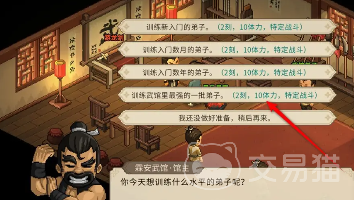 在霖安城中还可以在武馆中打工来获得赚取金钱的方式,首先前往武馆中与馆主对战,直到战胜馆主的十成功力,就会多一个赚钱选项,可以选择训练弟子的强度来获得不同水平的金钱,每一场战斗消耗的时间和体力是一样的,玩家可以先从最初始的来训练直到训练到最强的,一天可以训练四次,这也是一个赚取金钱的方式。