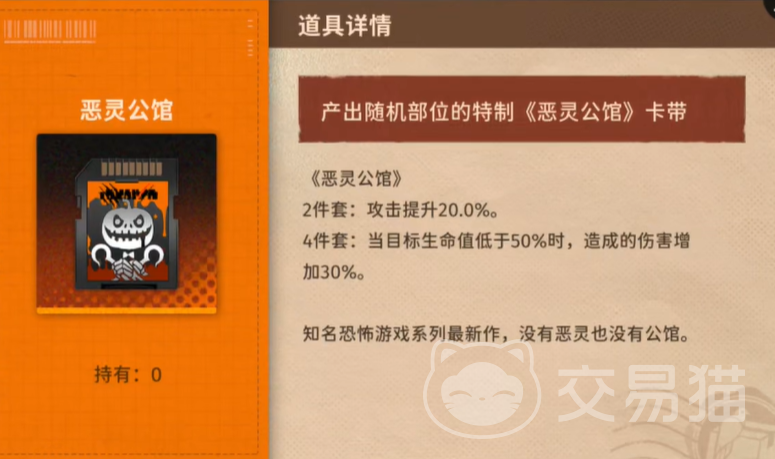 恶灵公馆这个装备的词条其实很简单,就是二件套的时候攻击力提升20%,而四件套的时候则是当对面生命值低于50%,攻击力增加30%,这个装备是比较适合攻击类,尤其是以收割为主的角色使用这套装备可以提升整体的强度哦,这套装备的灵感来源致命恐怖游戏哦!