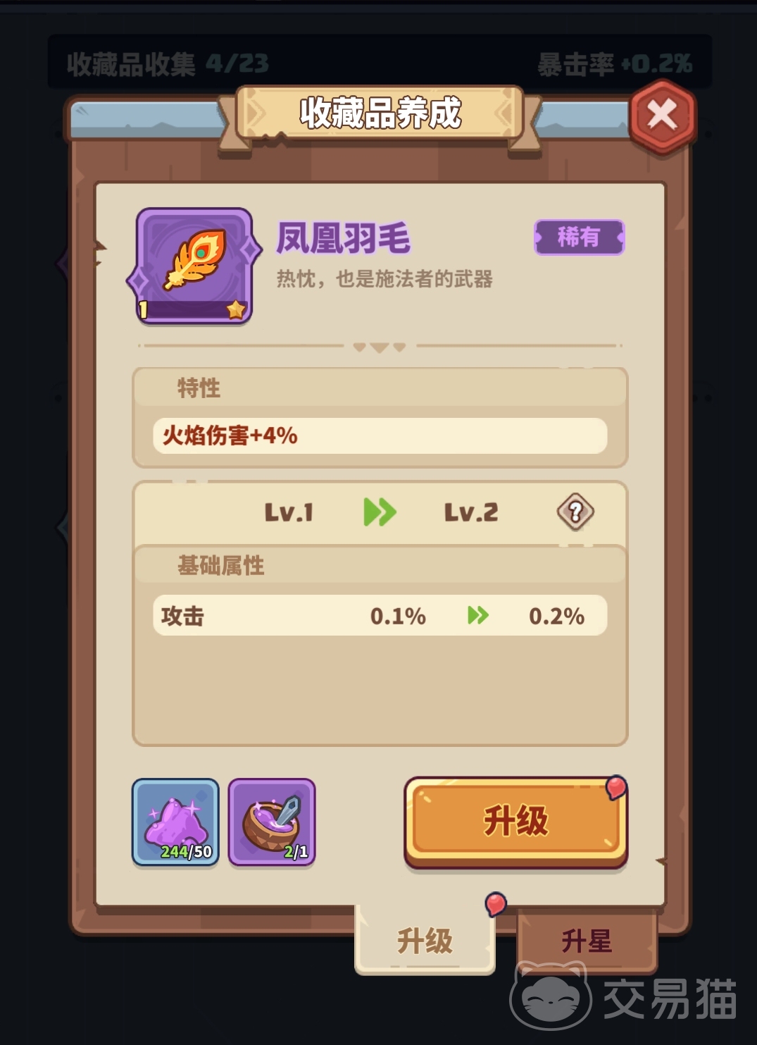 玩家获得的收藏品会在【领主】板块中显示,当寻宝获得相同的收藏品可用于收藏品的升星,收藏品升星后能提升伤害值以及有概率提升暴击值。想要对包藏品升级的话需要消耗秘能粉末和精炼溶剂,收藏品升级可以提升英雄攻击值。