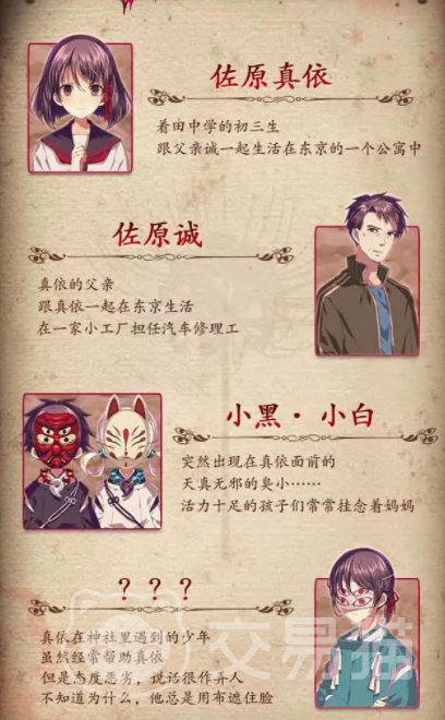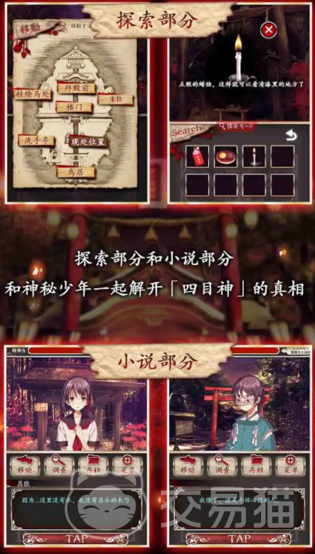 四目神游戏用相对比较精致的日式风格呈现出了一个小村庄,玩家将会进入到这个小村庄中,经历一些惊悚的事件,通过对于这个小村庄的探索,玩家将会逐步发现这背后隐藏的秘密,游戏不像其他的解密玩法一样需要玩家自行理清思路,寻找物品,而是会设定非常丰富的剧情,只需要根据这些剧情的设定前往指定的地点探索即可,针对于这些地点还会发生一些故事,这样玩家就可以通过解谜逐渐拼凑出事件的真相。