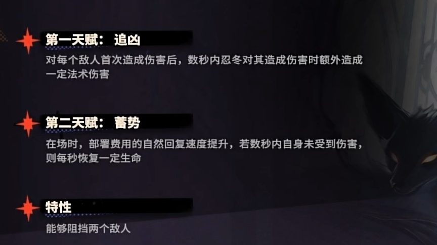 忍冬的1天赋是对每个敌人造成伤害之后,在接下来的数秒内造成伤害的时候将会额外的造成法术伤害。第二天赋则是忍冬在场的时候,部署费用的自然回复速度将会提升10%,如果在数秒内没有受到伤害,那么则每秒都恢复一定的生命值。