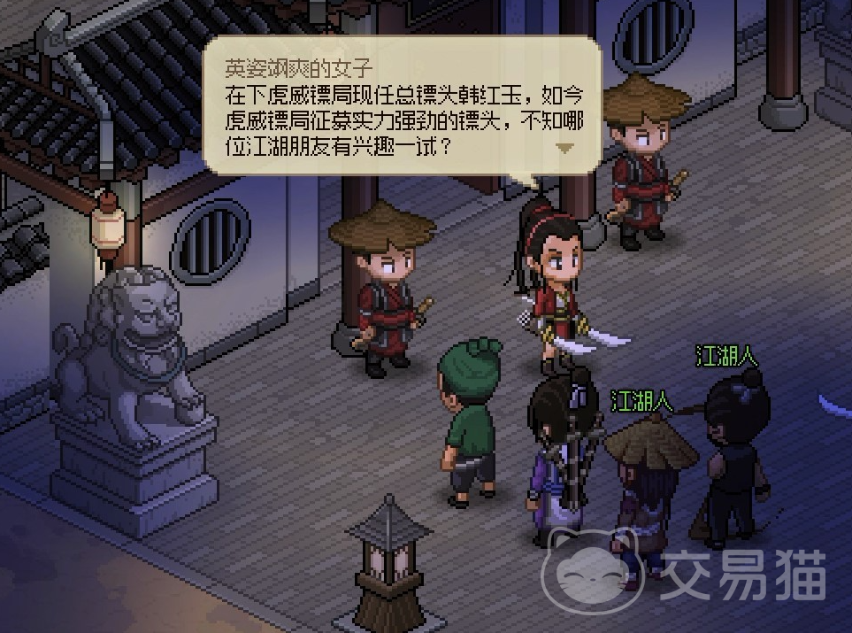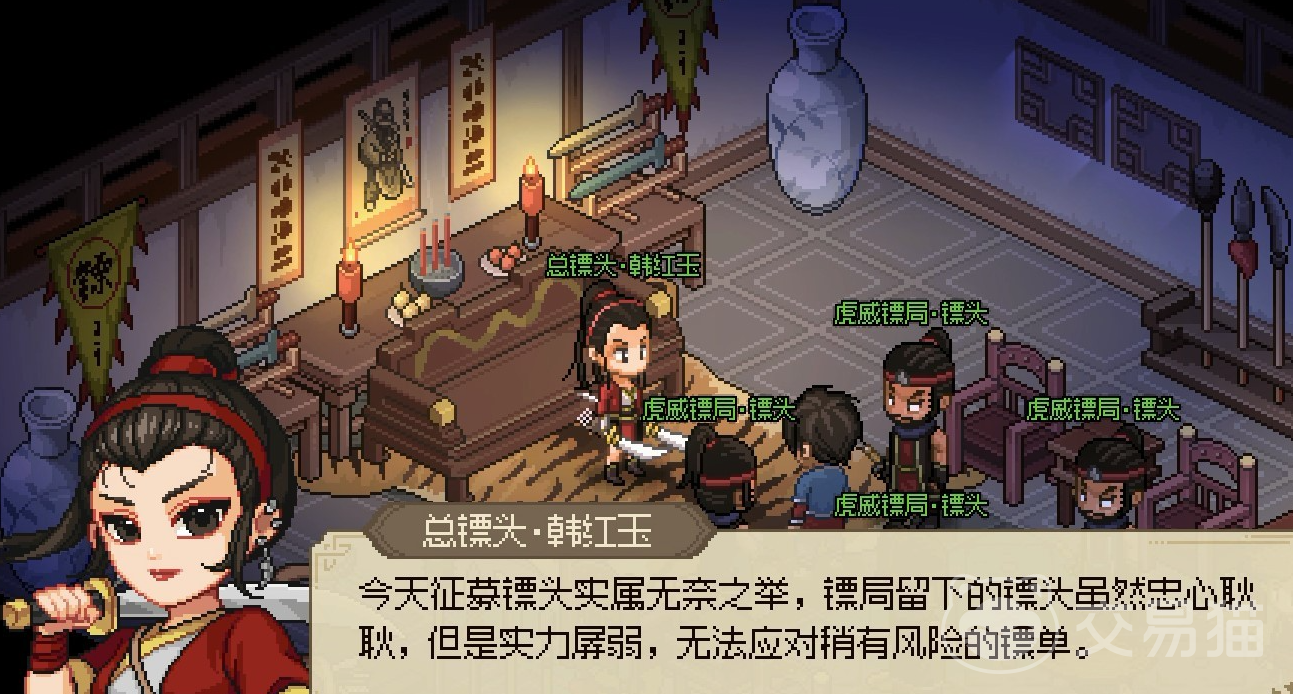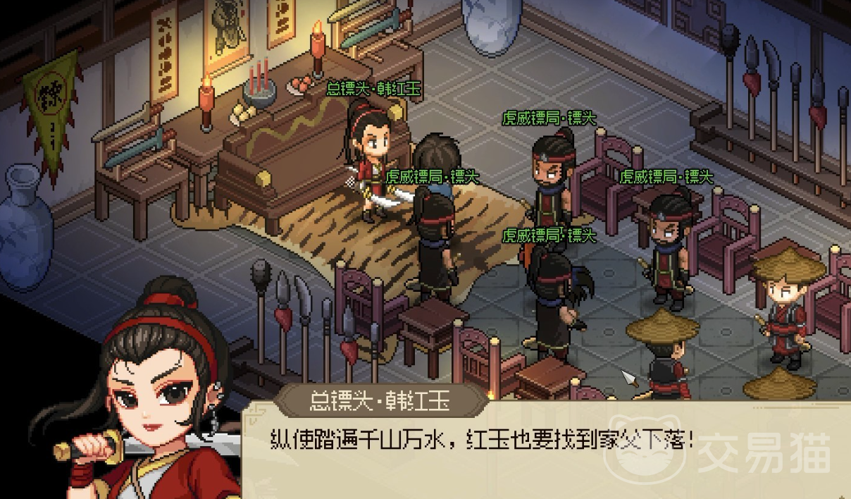 首先玩家需要先到楚襄地区的虎威镖局,这时会发现韩红玉在招募镖头,选择我来试一试后开始送镖,送镖很简单点击要送的货物,查看要送到的地址后前往将货物交给其主人后返回镖局就能拥有声望,再接新单刷声望,等到声望到1500的时候,回镖局虎威厅就会触发其他NPC逼迫韩红玉转让镖局剧情,这里选择帮助会触发战斗。