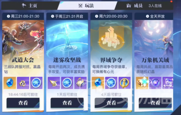 然后就是战队的各种玩法,像是武道大会、迷雾攻坚战、界域争夺、万象机关、荣耀之冠,每个玩法的具体内容也有简单概述这里就不展开介绍了。每个玩法的开启时间也是不一样的,一些重要的玩法记得不要错过,例如每周三的武道大会可以免费得到钻石和基础物资。界域争夺是每周六,可以拿百里守约的碎片。