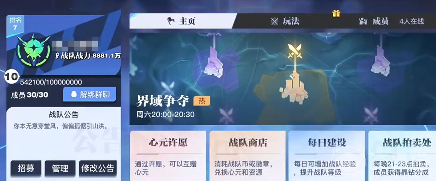 不管是喜欢打人机还是与其他玩家对战,加入战队都是明智的选择,因为通过战队玩法可以轻松获得许多提升战力的材料。某种意义上来看,战队也有点类似帮派,主页有战队的名称、战力、成员、大厅、玩法等。