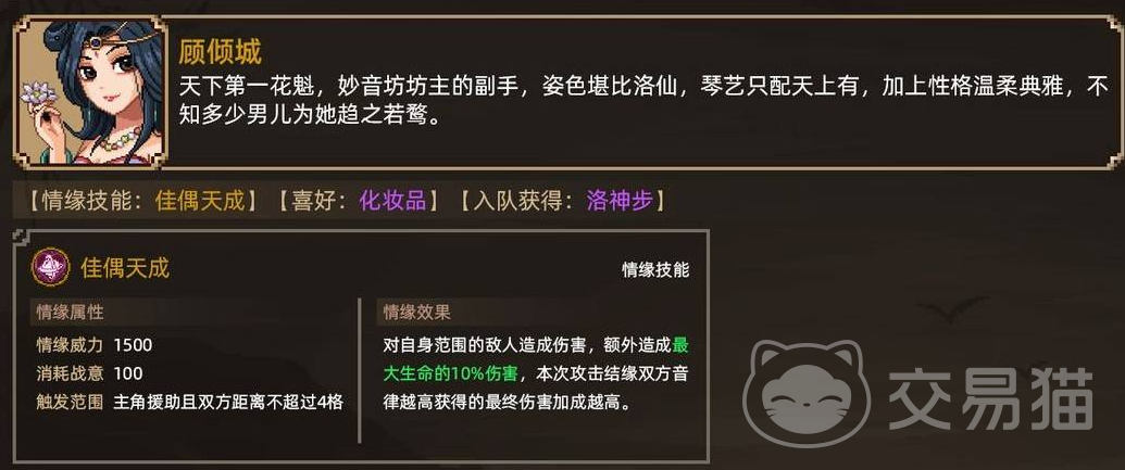 大侠立志传中的顾倾城是妙音坊的副手,天下第一花魁,性格独立而高雅,姿色也堪比天上的仙子,很多小伙伴们十分喜欢她,想知道怎么和顾倾城结缘,那么下面就来分享一份大侠立志传顾倾城攻略,帮助大家顺利与其结缘,喜欢顾倾城的小伙伴们赶紧来看一看本篇文章吧。