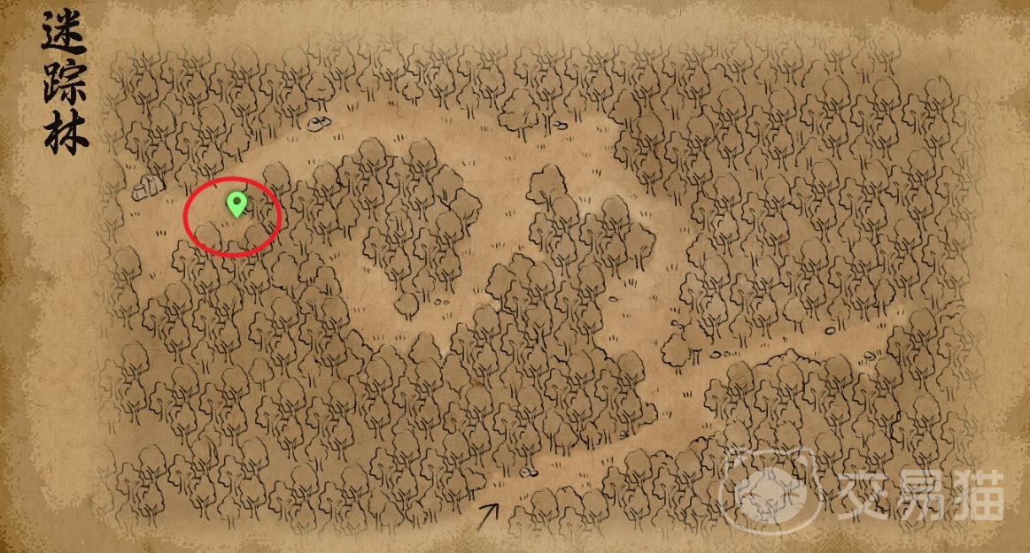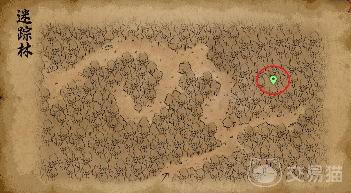 当然第一颗灵芝没有我们也可以找第二颗,第二颗位置在迷踪林上方出口附近,具体位置如下图所示,在出口附近仔细观察走动,可以路过一颗枯木,在枯木的旁边就能看到第二颗灵芝。