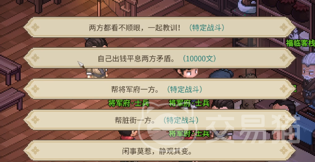 当大家想要去做这客栈任务的时候,就需要前往客栈然后与掌柜对话触发剧情,在剧情触发之后,会有将军府的人来,这波人会与客栈的人也就是脏街势力的人发生冲突。