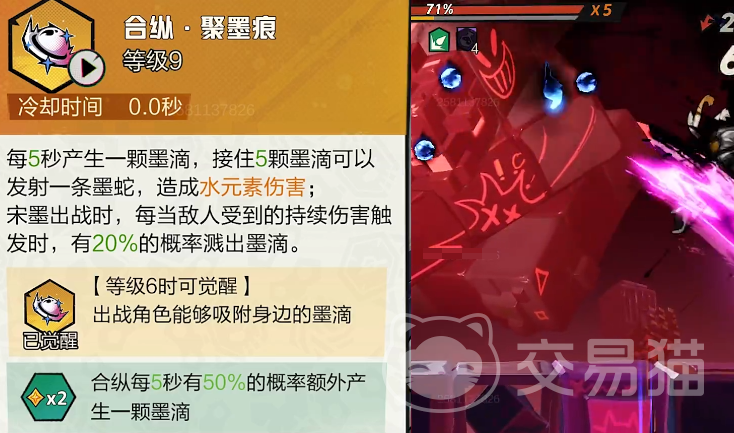 更为重要的实,宋墨的合纵技能每5秒产生一颗墨滴,出战时敌人每次受到持续伤害都有20%概率爆出墨滴,而每接住五颗墨滴都会发射出一条墨蛇,配合南柯大招自带的3层灼烧(每秒钟造成一次伤害),再配合南柯的合纵技能,出战任何角色每弹指4次都会附带灼烧效果,三种效果叠在一起伤害非常炸裂。