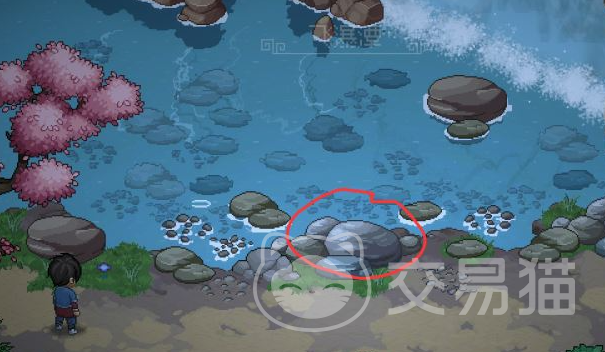 首先玩家需要前往吴越大地图的瀑布处,也就是本草门靠东一点的地方,到达这里后会发现有一个叫做飞瀑潭的地方,飞瀑潭的特殊事件会在下图红圈中石头位置处触发,所以玩家直接走到石头处。
