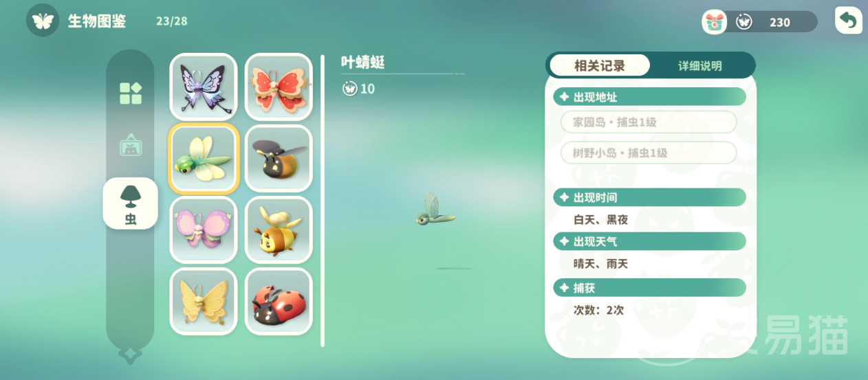 当大家开垦水稻等农田时,自然少不了可爱的蜻蜓啦!当你将其培育成为高等级的存在时,还会解锁竹蜻蜓的功能,带你在岛屿上面自由对的飞翔。然后前期能捕捉其他害虫,保护好你的农作物。