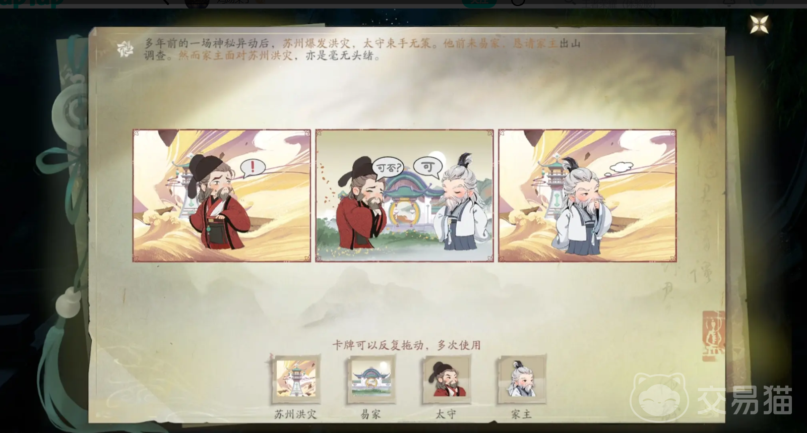 首先,第一块拼图上有苏州洪灾、易家、太守和家主。这些元素之间的关系非常重要。简单来说,苏州洪灾是背景,易家是关键人物,太守是负责的官员,而家主就是易家的领导者。把这些元素按照逻辑顺序排列好,就能解锁第一块封印。